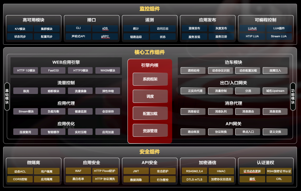 OpenNJet应用引擎是面向互联网和云原生应用给予的运行时组态服务程序。具备环境感知、安全控制、加速优化等能力,可利用动态加载机制实现不同的产品形态,如API网关、消息代理、入口/出口控制器、边车、负载均衡和WAF等。